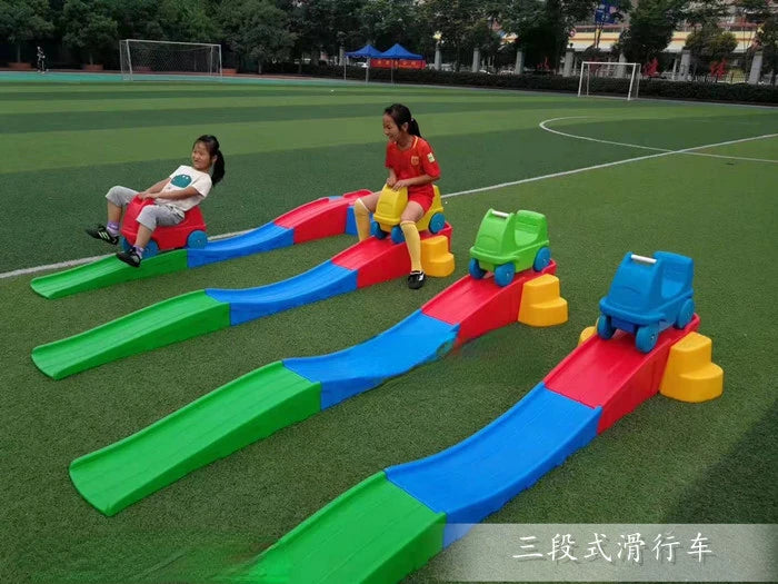 The Kindergarten Slide Car is a colorful and engaging play equipment designed for young children in kindergarten. This slide-car features three rails that provide a safe and fun sliding experience for kids.